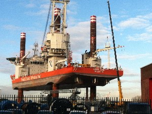 The Brave Tern is owned by Norwegian Fred. Olsen Windcarrier. The four legs of the Brave Tern are extended by Franklin Offshore Europe with fourteen meter each up to 92,4 meters. Also the frame and the boom of the ship’s crane are extended, in total with twenty meters. The crane is now capable to lift up to 120 meter above the deck of the Brave Tern. The modifications of the 2012 build Brave Tern are necessary because wind turbines become more heavy and the blades of the rotor blades becomes larger. Also wind farm are installed in deep water more often. Sister vessel Bold Tern will get the same upgrade later this year. The Brave Tern is now capable of carrying four complete ‘multi megawatt’ turbines, including towers and rotor blades. The vessel can operate in water depths up to sixty meters. The Brave Tern will first do a maintenance job at the North Sea, before heading to the US east coast where it will assist in the construction of the first US offshore wind farm.